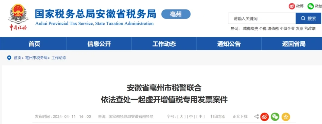 國家稅務總局亳州市稅務局第一稽查局根據安徽省稅務局稽查局下發案源線索,聯合公安經偵部門依法查處了蒙城縣某木業有限公司、蒙城縣某企業管理服務有限公司虛開增值稅專用發票案件。